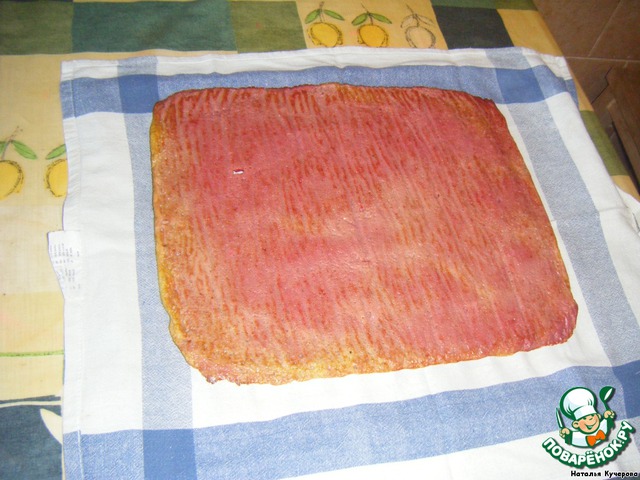 На проволочном подносе (я использую решетку от духовки) разложить чистое кухонное полотенце. Перевернув форму, осторожно вывалить свекольный пласт на полотенце и удалить пергаментную бумагу аккуратно, сдирая ее тонкими полосками. У меня получилось снять ее целиком, но здесь действительно нужно действовать очень аккуратно, чтобы не повредить запеченный "шедевр" :)