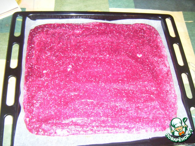 Свекольную смесь переложить пластом в форму для рулета и запекать в духовке в течение 15 минут.