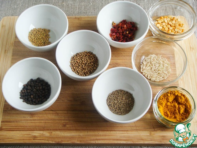 Для придания блюду характерного восточного аромата понадобятся специи. Для индийской кухни свойственны смеси специй, которые носят общее название "масала". Для смеси самбар-масала, кроме самих специй также понадобится сухой горох (индийский голубиный горох) и хороший рис. Я выбрала желтый горох и коричневый рис от "Мистраль".