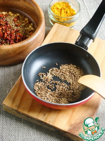 * Обжарке подлежат только целые специи (семена, стручки), в моем списке есть только одна уже смолотая - куркума, ее нужно пока отложить.