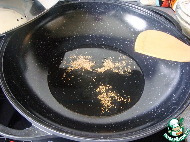 На сильном огне хорошо разогреть в глубокой толстостенной посуде/сковороде/казане растительное масло. Всыпать семена горчицы. Обжарить, помешивая, в течение 30 секунд.