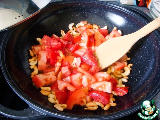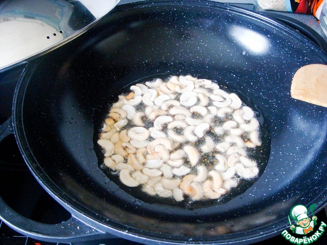 Добавить орехи кешью, обжаривать до легкого изменения цвета, после этого сразу добавить лук, обжаривать до золотистости.