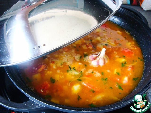 Залить водой (1часть риса:2 части воды), довести до кипения, утопить в содержимом головку чеснока, накрыть крышкой, уменьшить огонь и оставить на слабом огне на 20 минут или пока рис не впитает всю жидкость и дойдет до готовности.