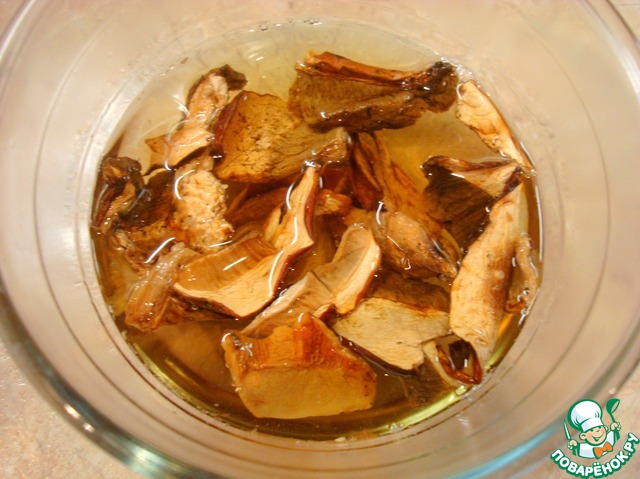 Сухие грибы замочить в 300мл кипятка на 20 минут.