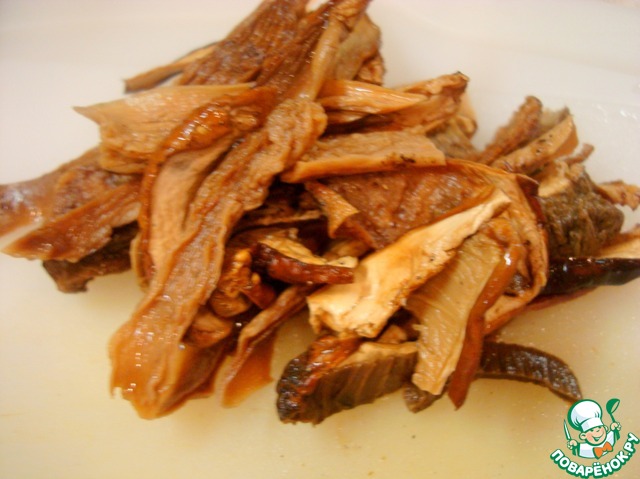 Воду слить в миску через сито, выстеленное бумажным полотенцем или салфеткой. Грибы промыть и порезать тонкой соломкой.