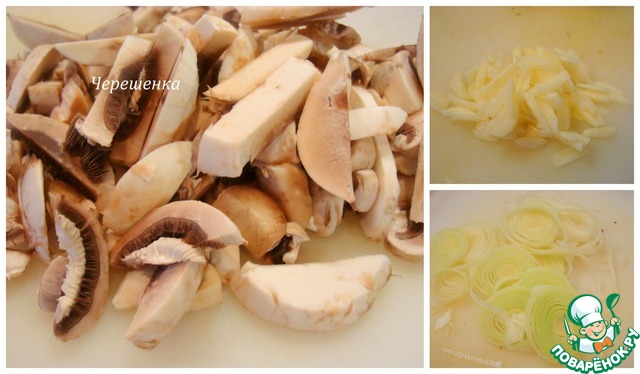 Шампиньоны нарезать соломкой, порей кружками, чеснок тонкими пластинками.