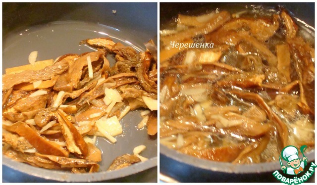 В сковороду налить 1 ст. ложку оливкового масла, разогреть, добавить порезанные сухие грибы, мелкоизмельченный чеснок, обжаривать 1 минуту.