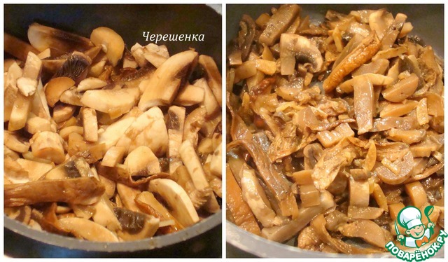 Добавить шампиньоны, обжарить еще минуту, закрыть крышкой и тушить на маленьком огне 20 минут.