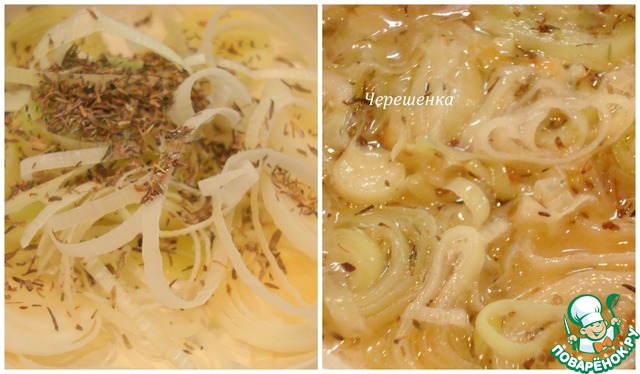 В маленькую сковороду или сотейник положить лук-порей, тимьян, налить 1 столовую ложку оливкового масла. Тушить 10 минут.