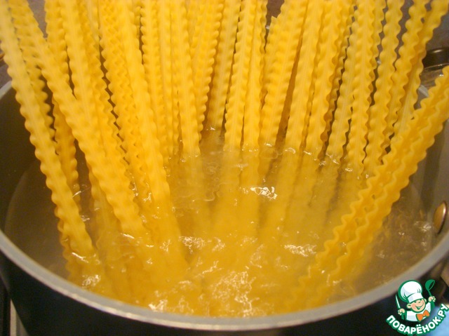Отварить пасту, слить воду через дуршлаг, отвар оставить. Добавить к пасте тушеные грибы, 1 ст. ложку оливкового масла, перемешать.