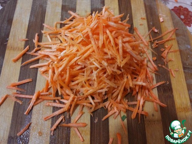 Морковь натереть через крупную терку, а лучше, если есть, через корейскую терку.