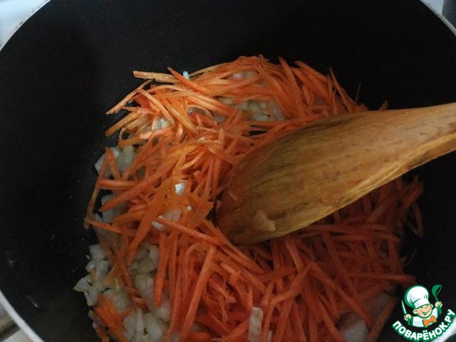 Лук и морковь быстро ( около 1 минуты) обжарить на раскаленном растительном масле и выложить в миску.