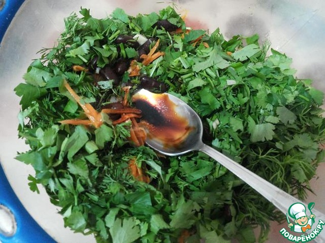 Соединить все овощи, положить нарезанную зелень, добавить соевый соус и соль по вкусу и перемешать.