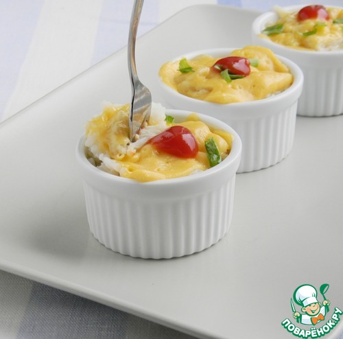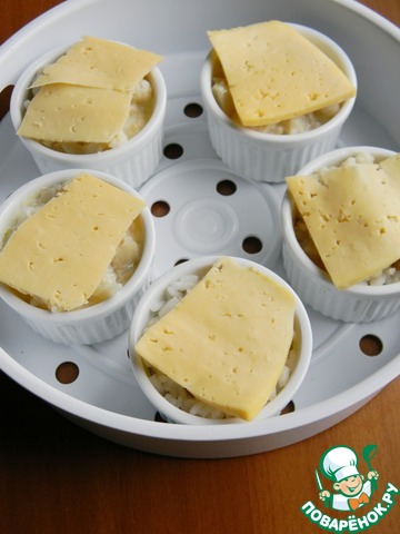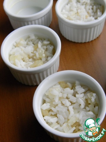 Формочки смазать маслом. Рис смешать с луком, посолить. Выложить в формочки.