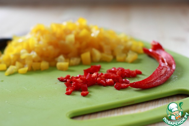 Тем временем желтый перец и чили освободить от семян и нарезать очень мелко, так, чтобы кусочки желтого перца были одного размера с фасолью.