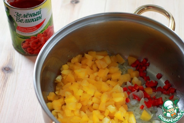Когда перловка и фасоль будут готовы, в кастрюле разогреть немного растительного масла и обжарить до прозрачности мелко нарезанный лук и чеснок. Затем добавить желтый перец и чили, подержать на огне минуту-две.