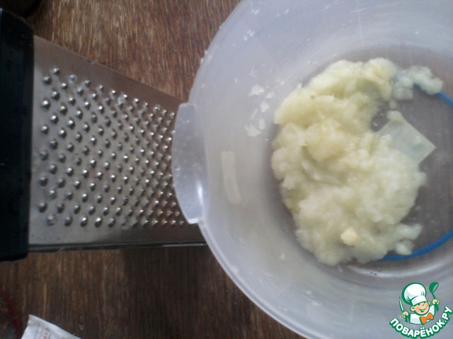 3. Трем 0,5 луковицы на мелкой такой терке, у которой кончики торчат... ну вообщем она на фотографии. Получается кашица. Лук обязательно тереть до картофеля, для того, что бы картошку сразу смешать с луковой кашицей. В этом случае картофель не темнеет. Ну и на заметку: если трете картошку и не хотите что бы она потемнела, то смешиваете с луковым соком или кашицей.