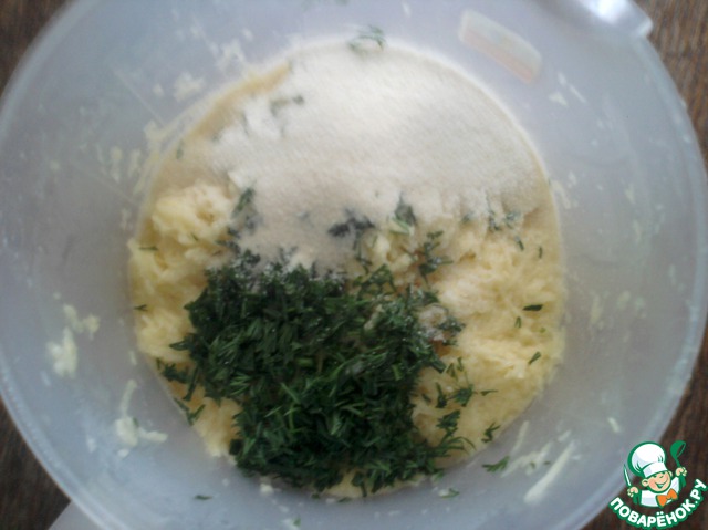 5. Добавить соль, чеснок, зелень. Все хорошо перемешать.