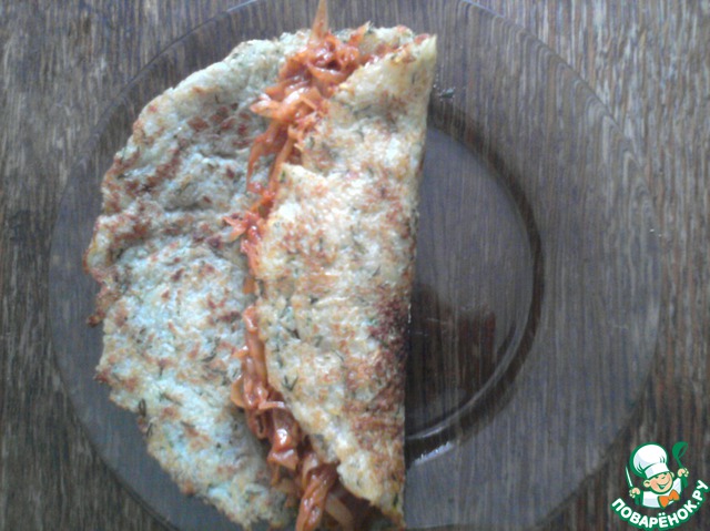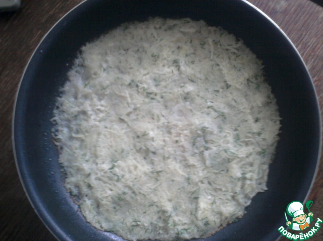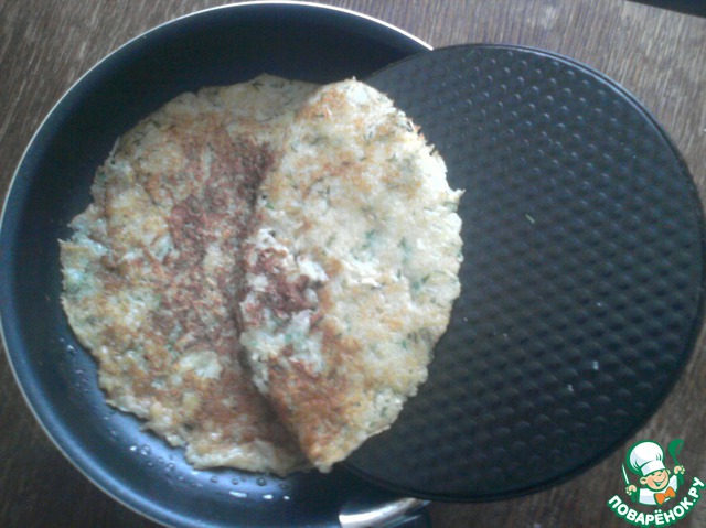 7. Жарить минут 10 на не большом огне... Хотя время я не засекала. Вообщем лопаточкой приподнимать край и проверять степень поджаренности блинчика. Как только блинчик достаточно поджарится, то лопаткой проверить нигде ли он не прилип. Убедитесь, что он отстает от сковороды. Далее не пытайтесь его перевернуть - это не реально. Берете дно от разъемной формы для выпечки, переворачиваете его нижней частью, т. е. той которая без бортиков, даже маленьких. Вкладываете его в сковороду и переворачиваете ее к верх ногами. Ну и выкладываем блинчик обратно в сковороду, но уже другой стороной. Если нет формы для выпечки, берите что - то плоское, ну и логика та же. Поджариваем вторую сторону.