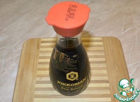 Смешать в миске рассол (повторюсь: у меня от зеленых оливок), соевый соус, растительное масло, соль, сахар и соду (соду гасить не нужно, она погасится рассолом). Муку просеять и всыпать в смесь.
