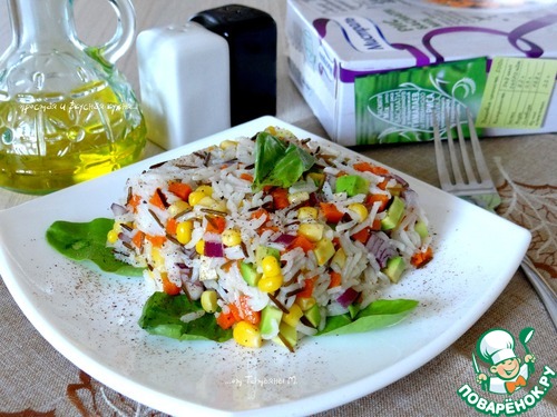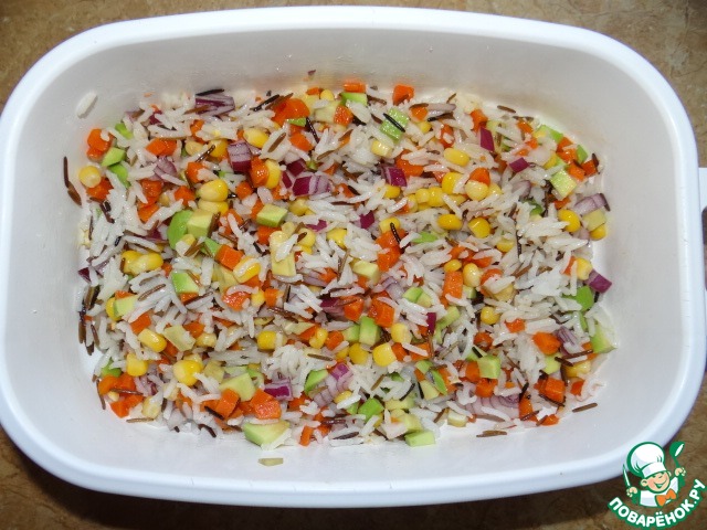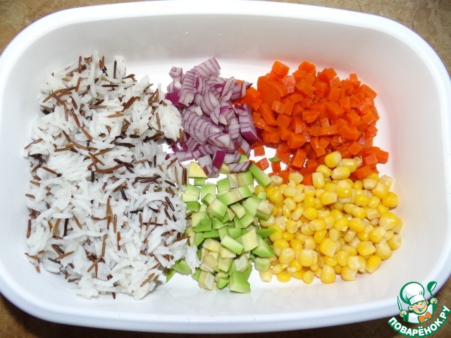 Морковь, авокадо, лук порезать мелкими кубиками - добавить рис, кукурузу;