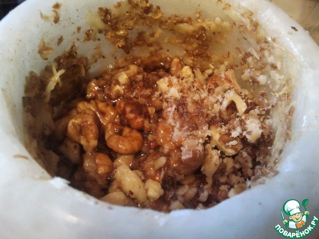 Добавить орехово-чесночную пасту. При необходимости добавить еще отвара. Накрыть крышкой, тушить на медленом огне 5-7 минут.