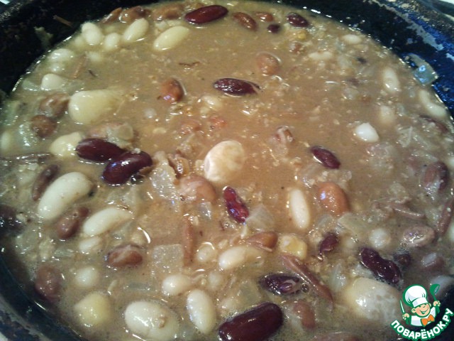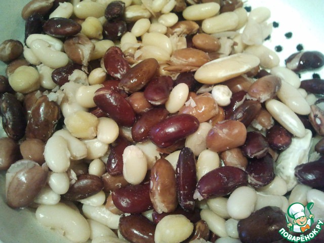 Фасоль замочить на ночь в воде. Утром воду слить. Залить фасоль холодной водой, довести до кипения, варить 10 минут на медленом огне. Воду слить. Фасоль промыть. Залить новой водой. Не солить! Иначе фасоль будет твердой. Снова довести до кипения. Варить под крышкой на медленом огне 30-50 минут в зависимости от сорта фасоли. Посолить и варить еще 10 минут. Конечно лучше не смешивать разные сорта фасоли, т. к. каждый сорт варится разное время, но у меня была "готовая" смесь, поэтому некоторые сорта немного переварились.