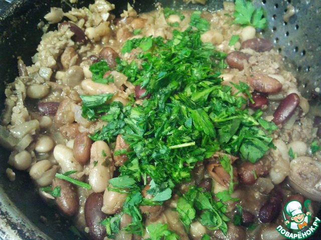 Добавить фасоль, влить стакан фасолевого отвара. Приправить специями, накрыть крышкой и тушить еще 10 минут.