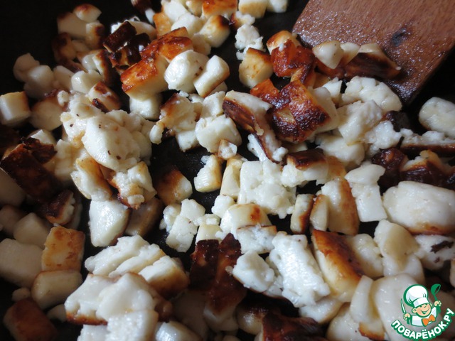 Пожарить сырные шарики (или кубики) на сковороде с добавлением 1 ст. л. масла.