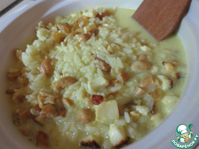 Когда уровень воды сравняется с рисом, добавить смесь молока, изюма и орехов (предварительно вынуть оттуда сырные шарики/кубики; я вынула не все - предпочла, чтобы и в рисе были кусочки сыра).