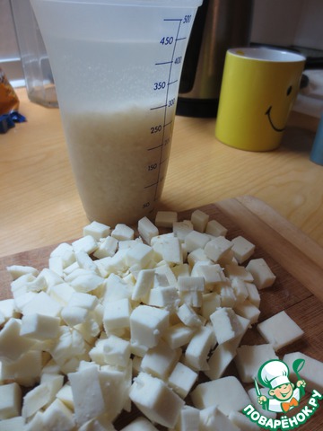 Измельчить адыгейский сыр и сделать из него шарики, либо нарезать кубиками, как показано на фото, впрочем, можно кусочки побольше делать.
