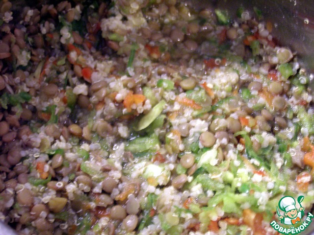 В овощную смесь добавим сваренную чечевицу и кинву, яйцо и специи. Все хорошо перемешать. 2 столовых ложки кинвы и немного моркови оставить для соуса.