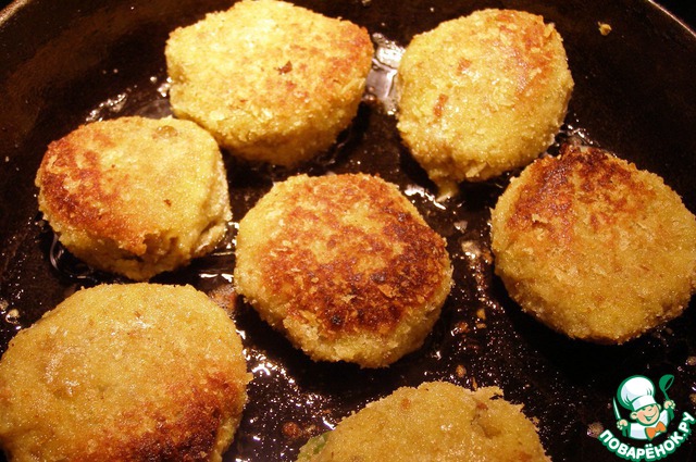 Формируем и обваливаем в панировочных сухарях котлеты. Обжариваем на маленьком огне.