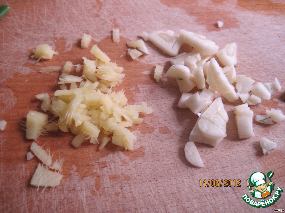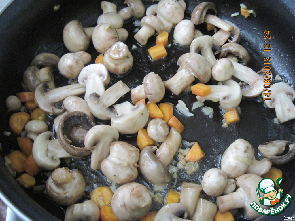 На сковороду с нагретым маслом бросаем чеснок и имбирь, жарим 1 мин, добавляем порезанную морковь, грибы, солим, жарим 5-10 мин, затем добавляем порезанный лук, жарим до готовности лука.