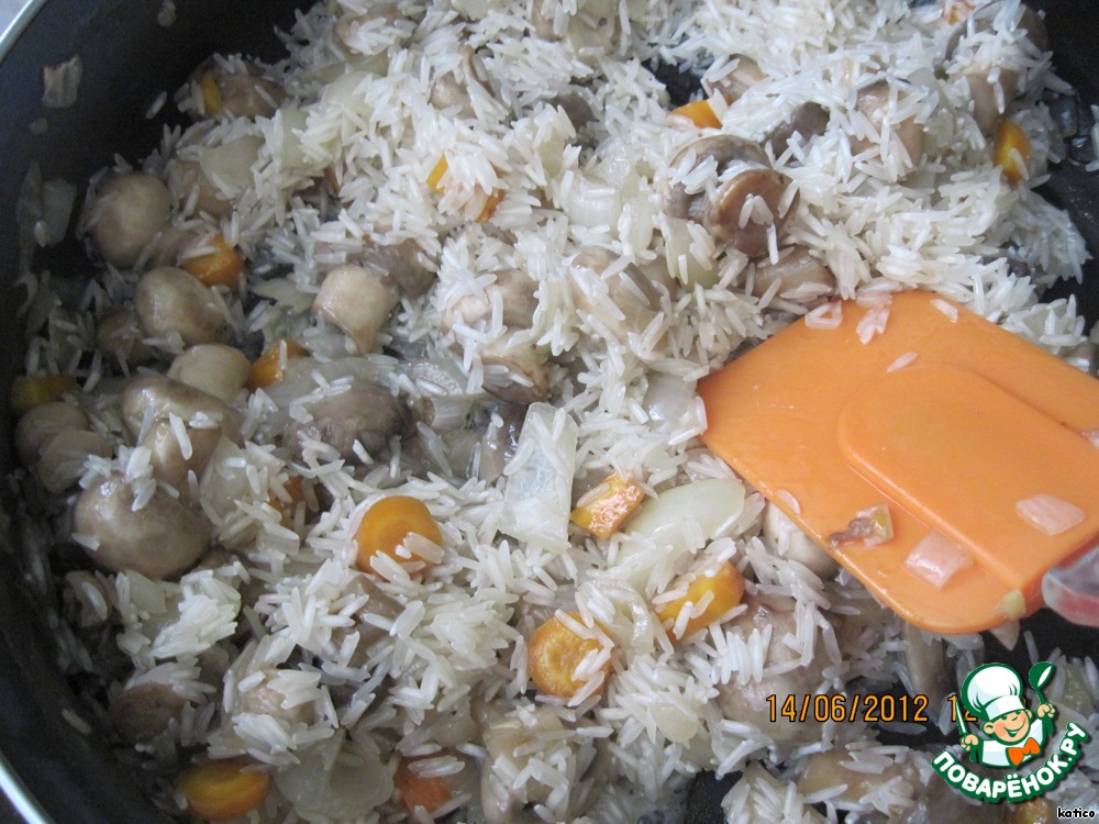 Готовим рис с овощами под крышкой 15 мин, затем добавляем к рису горошек и перемешиваем, готовим под крышкой 5-10 мин, рис перемешиваем, огонь выключаем и даем рису постоять еще 5 мин под крышкой.