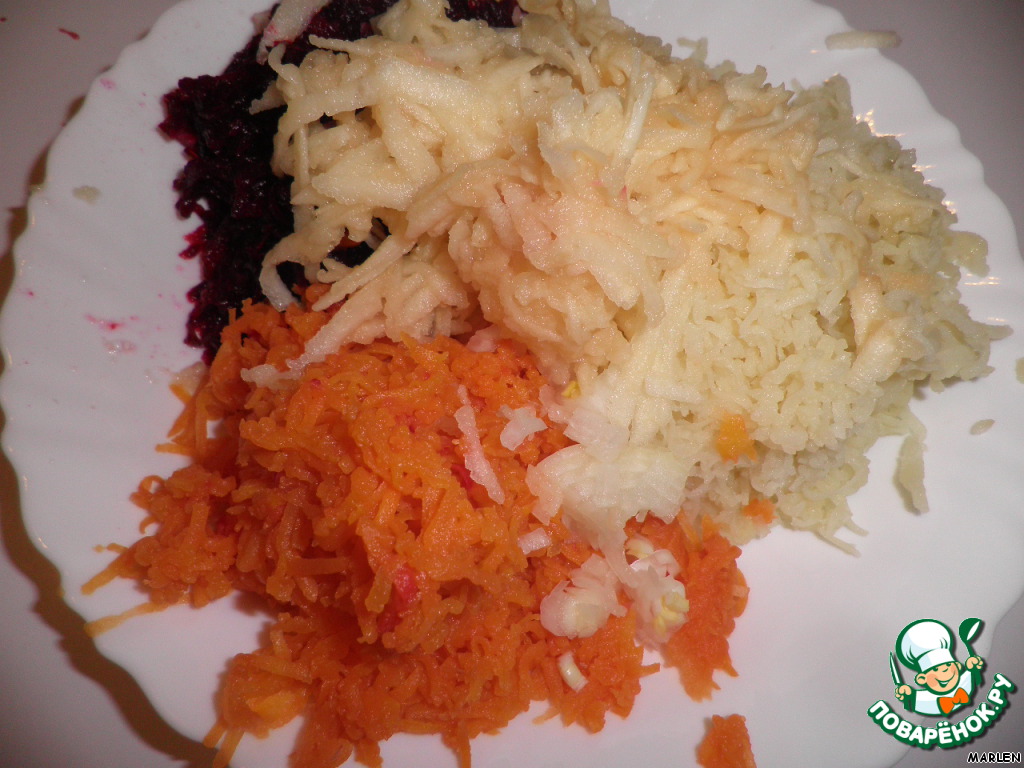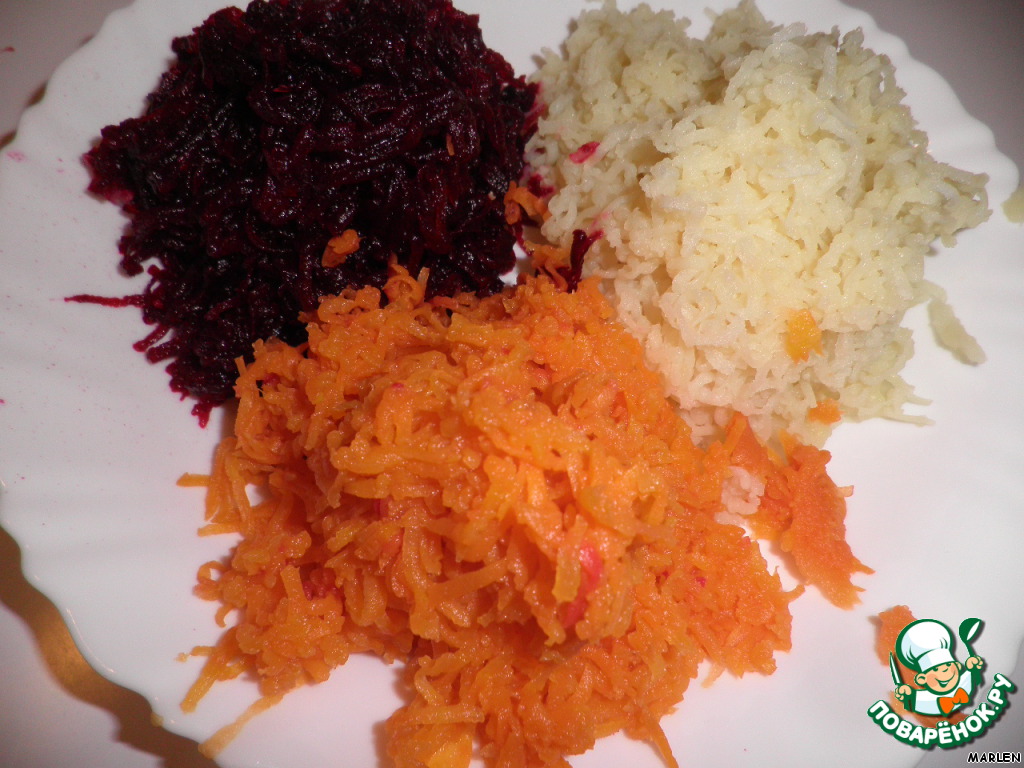 Вареную свеклу, морковь, картофель очистить и натереть на мелкой тёрке.
