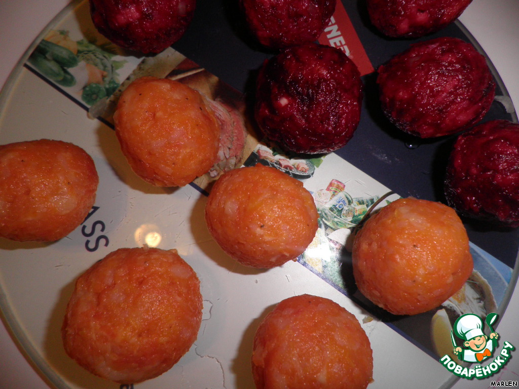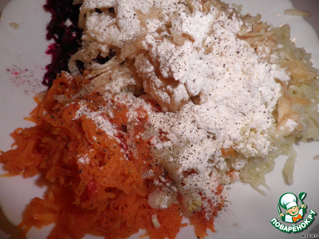 Добавить к овощам муку,специи и всё хорошенько перемешать.Если хотите только оранжевые фрикадельки,то готовить без добавления свеклы.