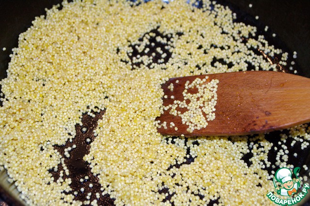 В сковородке разогреем 2 ст. ложки масла на среднем огне, добавим пшено и помешивая, обжарим до золотистого цвета и аромата, примерно около 3 минут ( замечание: не перестарайтесь).