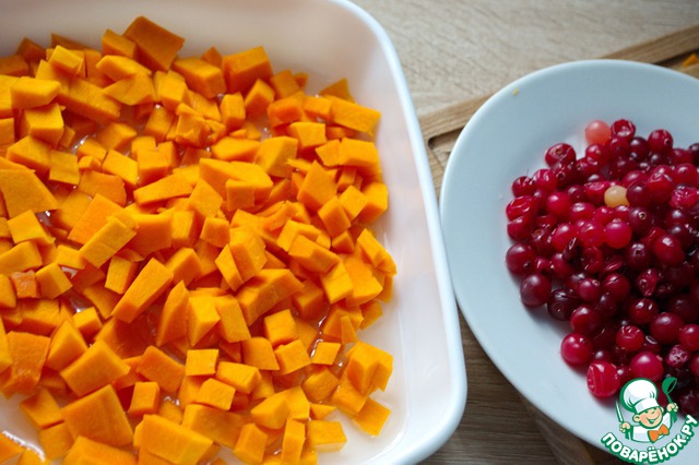 В блюдо для запекания добавим оставшееся оливковое масло. Тыкву порежем небольшими кусочками и выложим в блюдо для запекания.