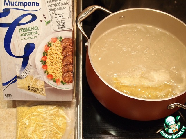 Наливаем в кастрюльку воду, добавляем соль (1/2 ч. л.), ставим на огонь и доводим до кипения. Пакетики с пшеном кладем в кипящую воду и варим 25 минут.