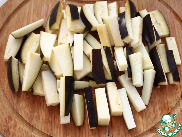 Баклажан моем, нарезаем соломкой и замачиваем в холодной подсоленной воде на 5 минут, чтобы ушла лишняя горечь.