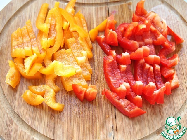 Перцы моем, очищаем от семечек и нарезаем соломкой.