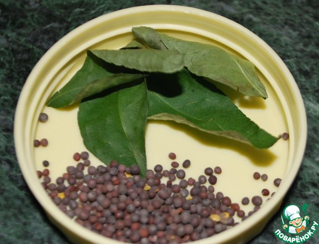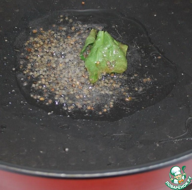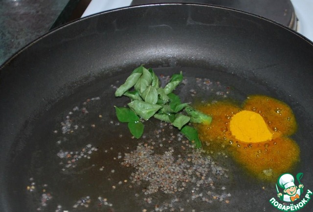Налить 1 ч. л масла на сковороду, обжарить семена горчицы и листья карри на среднем огне в течение минуты после того, как семена начнут потрескивать и лопаться.