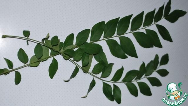 Вот так выглядят веточки с листьями карри. Они, кстати, не имеют никакого отношения ко всем известной смеси специй карри. Конечно, их очень сложно найти в магазине, но мне повезло – у меня этот кустарник растет прямо во дворе.
