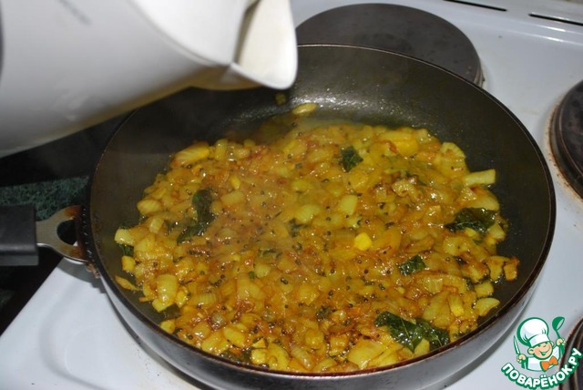 Когда они начнут трещать и лопаться, добавить к ним порезанный лук, листья карри и куркуму. Для желающих возможен вариант с небольшим количеством зеленого чили. Обжаривать минут 5-10 до готовности лука.