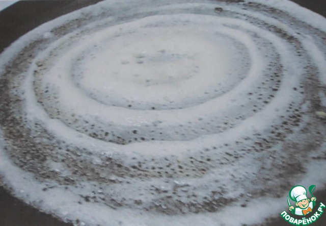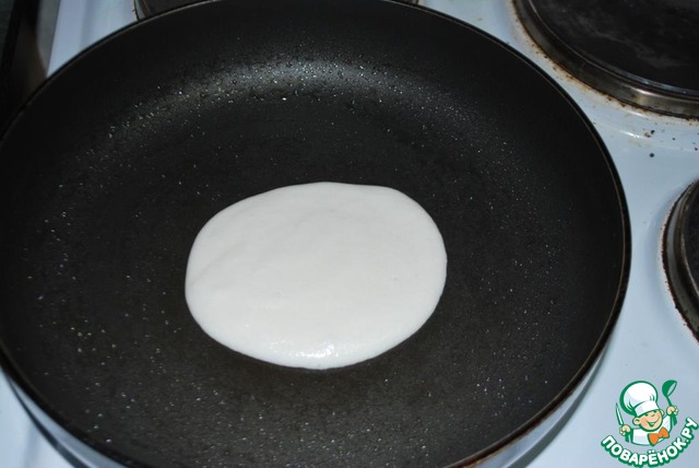 Процесс распределения теста по сковороде я сфотографировать не смогла, т. к. орудовать ложкой, придерживать сковородку и одновременно фотографировать несколько затруднительно. Но результат я запечатлела.