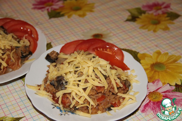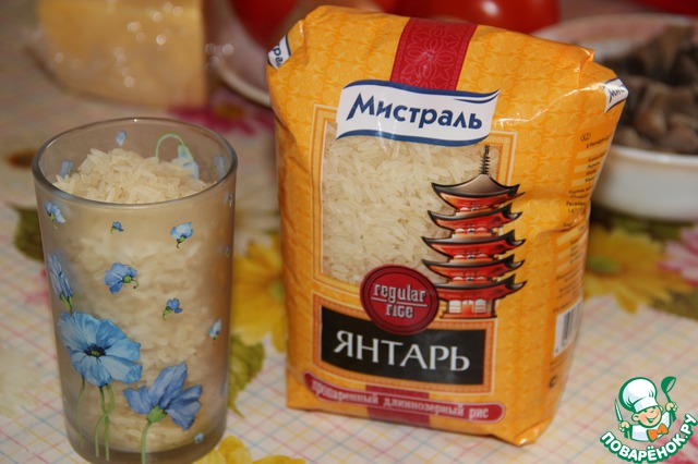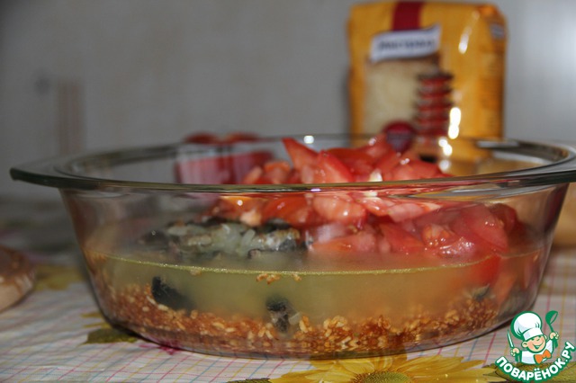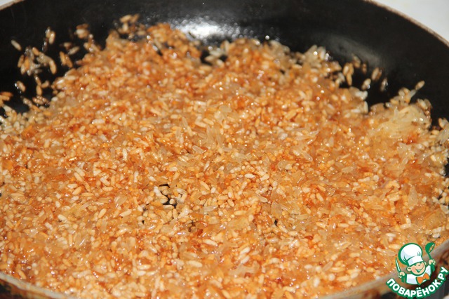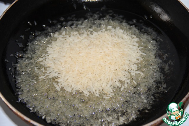 Теперь берем посуду для духовки-у меня стеклянная утятница-и выкладываем в нее рис обжаренный