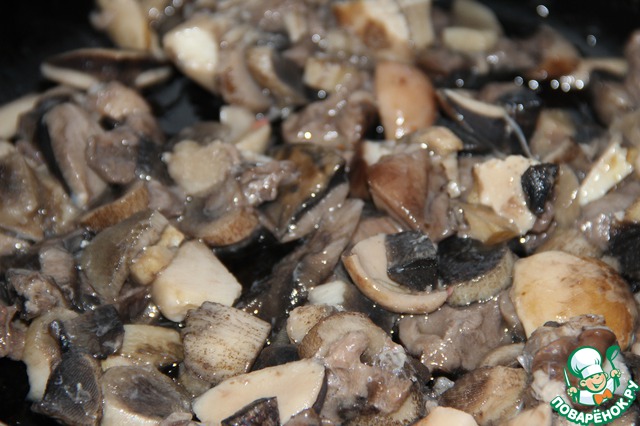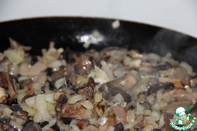 Теперь добавляем в грибы лук и немного еще обжариваем