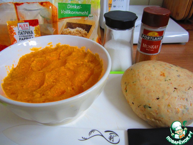 Сырую тыкву и лук я натерла на мелкой терке. Добавила мускатный орех и соль.