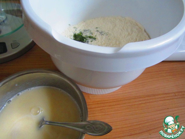 Замешивание теста я не фотографировала, поэтому опишу вкратце. В муку вливаем теплое молоко, половину чайной ложки сахара и 1 чайную ложку соли без горки и 2 столовые ложки растительного масла. Добавляем зелень по вкусу, как свежую так и сухую.